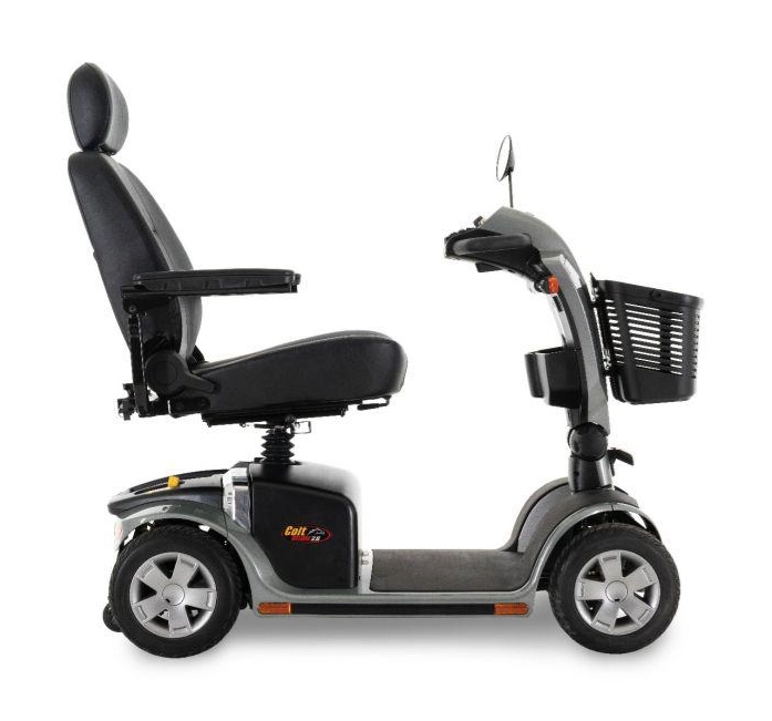The improved Colt Deluxe 2.0 from Pride Mobility Products® Ltd, offers a modern design and compact mobility via a unique drive system and exclusive non-scuffing, black, low-profile tyres. The Colt Deluxe 2.0 features an additional USB charging port, storage/cup holder and frosted LED headlights; perfect for manoeuvrability, comfort and safety.